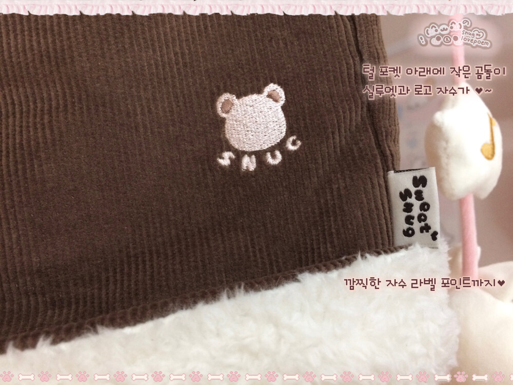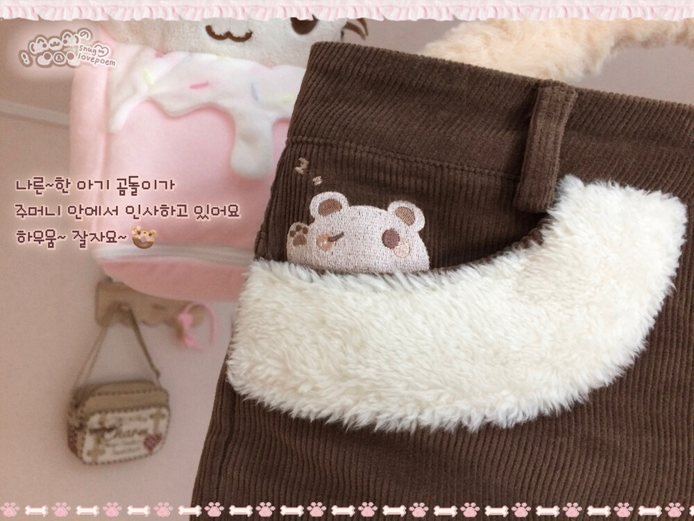 오른쪽 포켓 안에는 얼굴을 빼꼼 내민 채 주인의 품 안에서 편안히 잠을 청하는 작고 귀여운 아기곰돌이 자수가 있어요 (՞ ⌯₄⌯ ՞) ♡