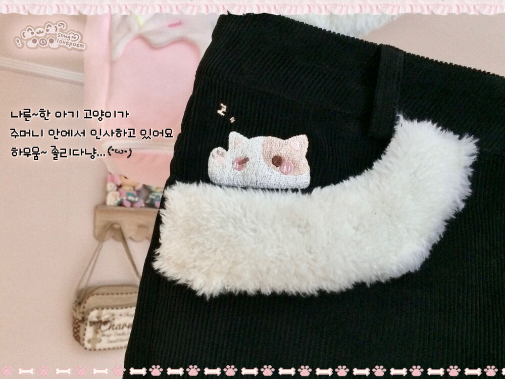 오른쪽 포켓 안에는 얼굴을 빼꼼 내민 채 주인의 품 안에서 편안히 잠을 청하는 작고 귀여운 아기고양이 자수가 있어요 (՞ ⌯₄⌯ ՞) ♡